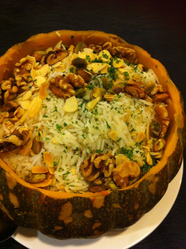 经过一轮大鱼大肉之后,大家可能饱腻了,而错过这盘具有路易斯安那特色的南瓜饭(Lousiana Pumpkin Rice)了,毕竟在圣诞节能端出这样的饭也算罕见了。这盘饭盛于一颗南瓜内,配搭这杂果仁,流露着一股清香,是吃过了那么多重口味的圣诞美食后的救赎。本来还想多吃几口,但一下就被不懂谁拿去了。这家伙真识货!