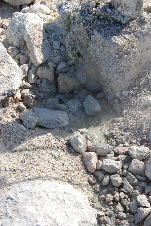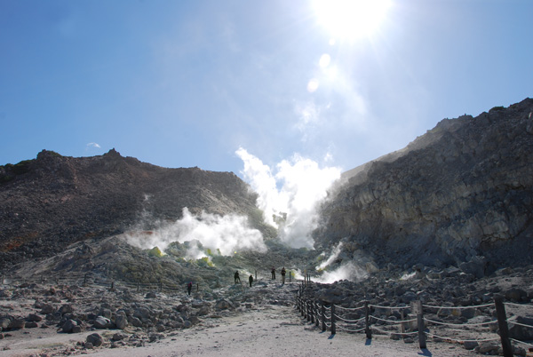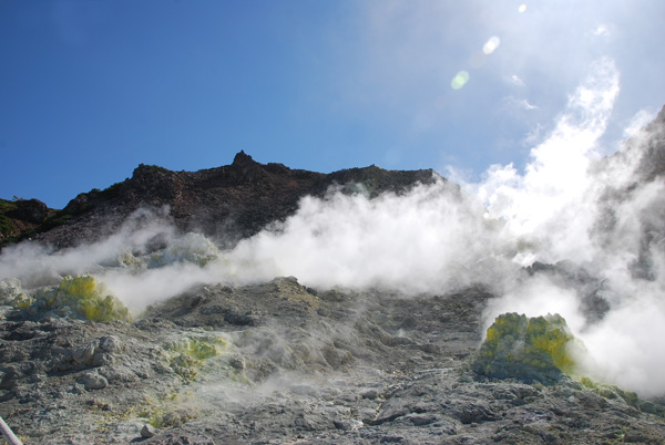 远处可见热蒸汽由火山口喷出,走近一看,可发现一些泉源冒着水泡咕噜咕噜地喷出热泉水。