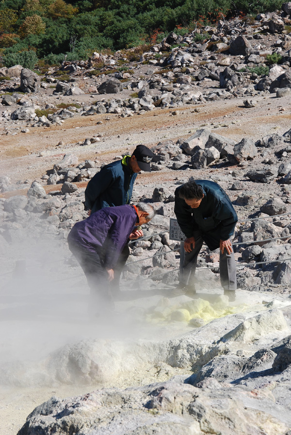 这里到处都有小心高温的告示牌,以免游客们烫伤。摸不到硫磺泉,大可到店里买温泉蛋来吃,能把鸡蛋煮熟证明水温也不低。