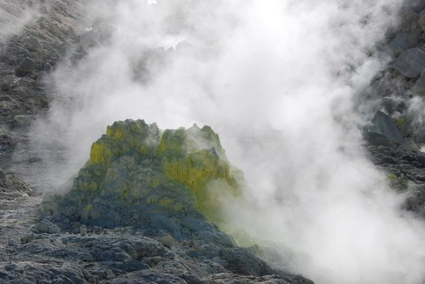 这座在一片绿林中的黄白山头,少了绿茵装扮,看起来就像赤裸的山。还未抵达目的地,就已嗅到阵阵硫磺气味。这里寸草难生,地面尽是硫磺痕迹。不时一阵强风吹来,带着细沙石和一股臭鸡蛋的味道,游客纷纷掩鼻避开。