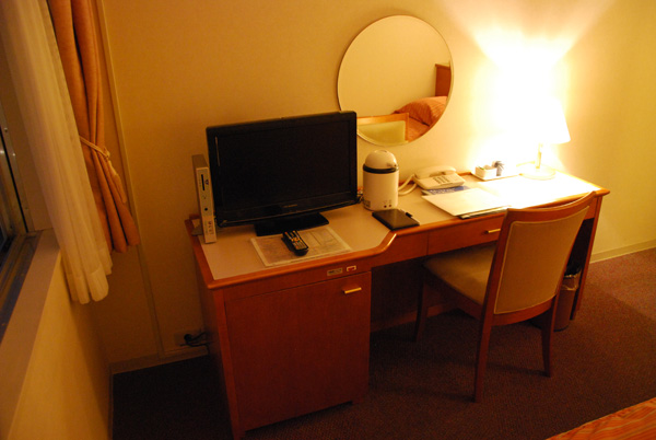 结束了一天的观光行程,大伙回到靠近纹别观光协会的酒店休息。一般日本城市酒店是没有泳池和健身房的,也当然不会有日本温泉。如果要使用温泉服务,可以到酒店附近的温泉馆,须另付费。我入住的房间是标准的单人房,有浴室、电视和热水壶。当然,看付费电视必须另外在酒店房间外的电视卡贩卖机买卡,才能观看特别的频道。