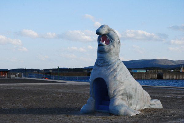 在远远就能看见这座残旧的海豹塑像。