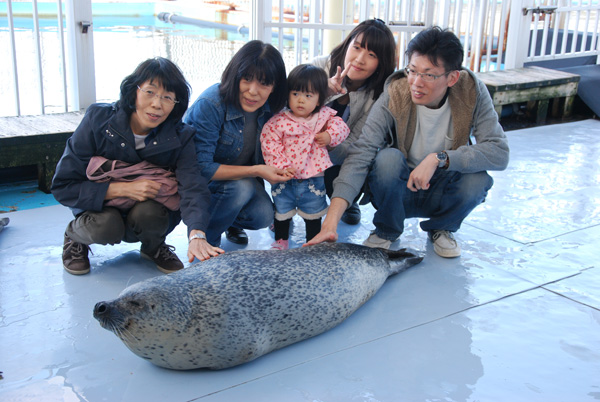 一家大小都欢迎来抚摸海豹并合照,你看它多享受!