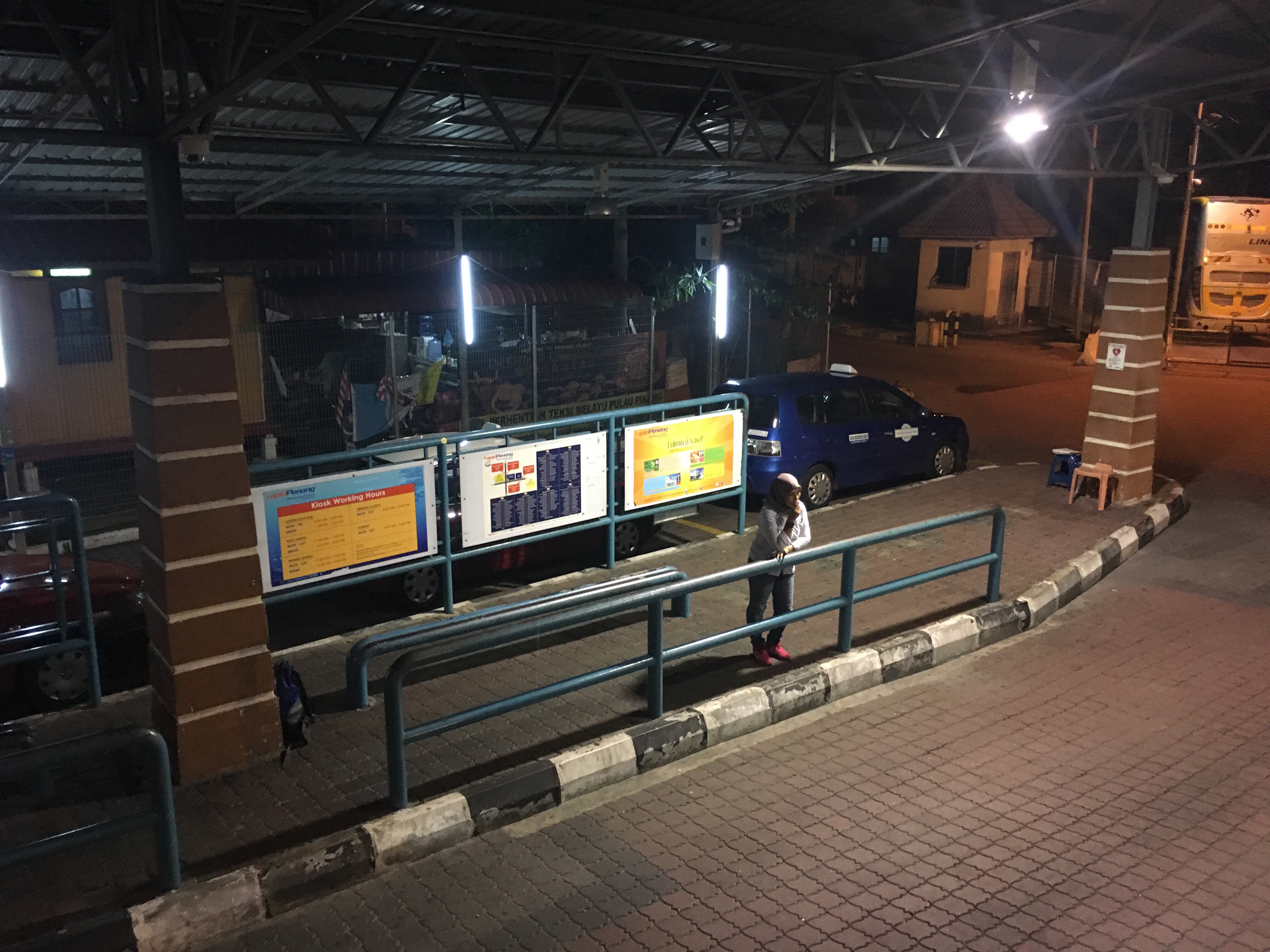 晚上11点35分抵达离家15分钟车程的大使巴士站。这里的巴士都是开往马来西亚北部城镇,最热门的目的地应该是北海、亚罗士打、玻璃市等这些马来西亚北部的大城镇,甚至也可以从这里乘搭巴士直达马泰边境,更有巴士公司专营泰国合艾的直通快车服务。巴士站位于已易名的大使路,但是大使路已成了市民所熟悉的名称,一时间也很难转换这些地标的称呼。国家勾球场和网球馆就在这座长途巴士站两边,但我从来不知道市区会有什么公共巴士途径这里。至少,从我家是无法乘搭公共巴士抵达这里,就算有,也不可能营运至半夜。所以,我选择了从智能手机中的网招车应用程式里,叫来了一个驾驶第二国产车所出产的休旅车Alza的马来司机,载我过去。