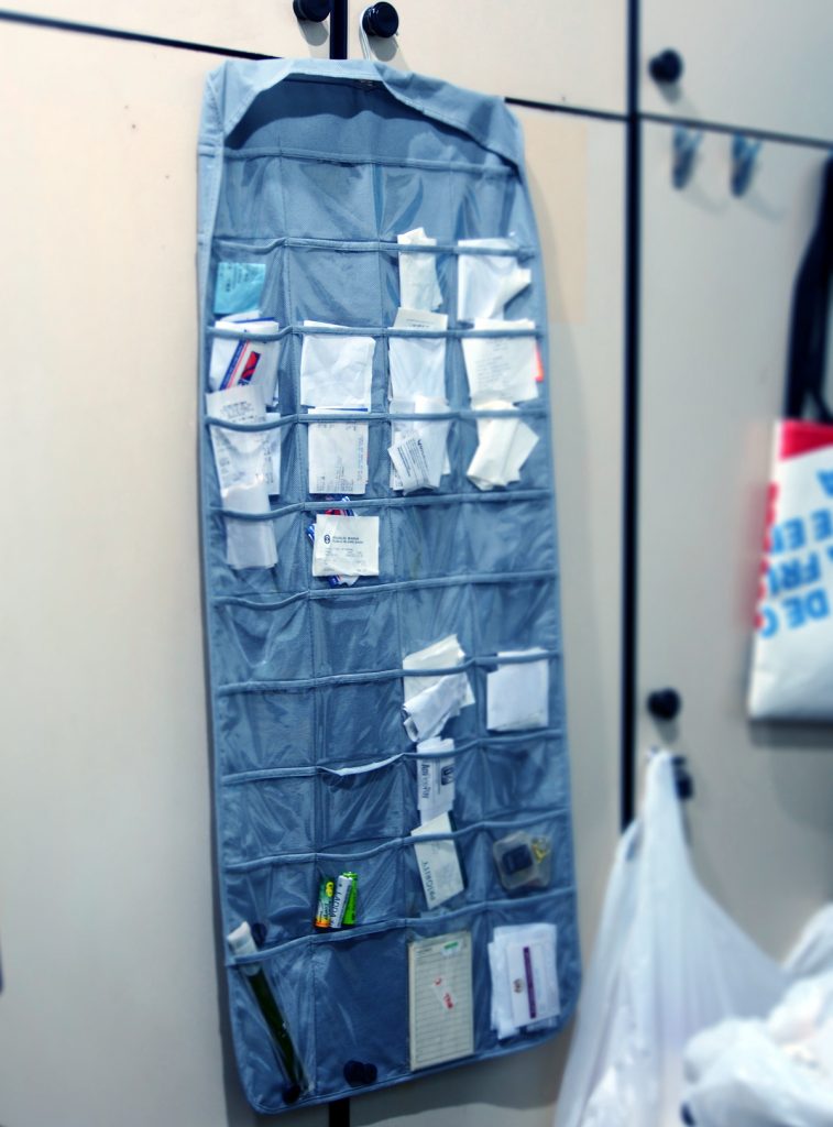 1)今天是最高元首诞辰补假,所以就不修理东西了,来看看可以帮助你管理收纳的好用具。这个挂袋一共有两面,每一面有40个透明袋子,其中36个是短的,最底下的4个是长一点的。我想这个挂袋的用途一般是用来收纳小饰品,比如耳环、胸针、蝴蝶结、首饰等,但我没有那么多饰品,所以就用来做一个消费行为视觉看板。