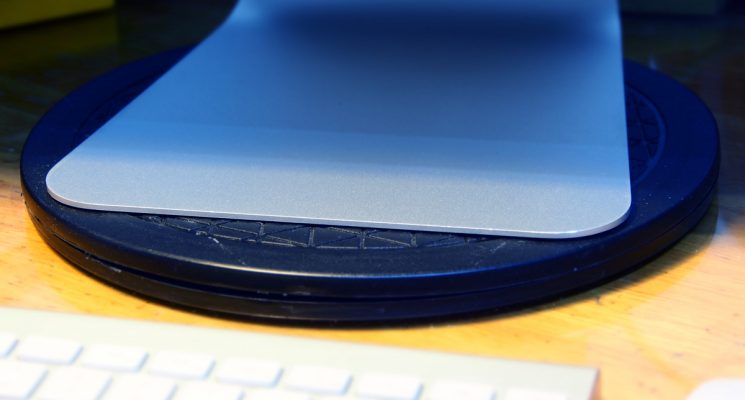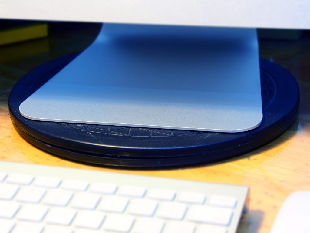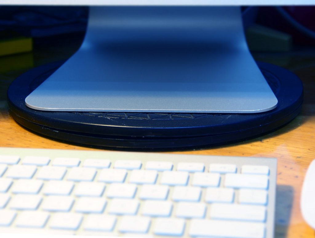 4)薄薄的一片转盘,可承受的重量还是蛮大的。这台iMac大概14kg,转动起来也是顺畅无比。我觉得越重的物品放上去会转得越顺利,反而你用手去转动这片转盘时会觉得卡顿,可能少了一点重力。