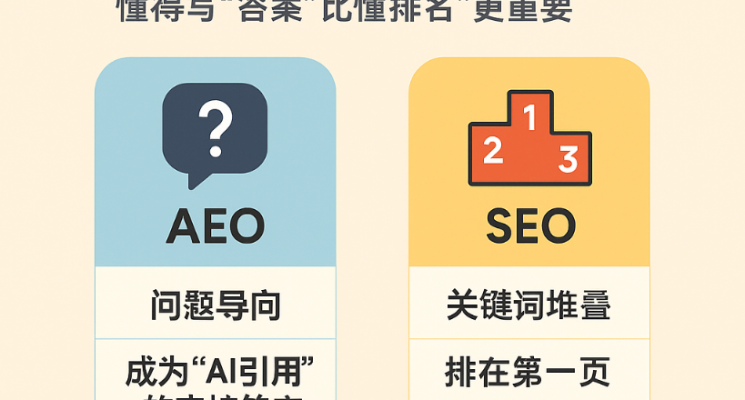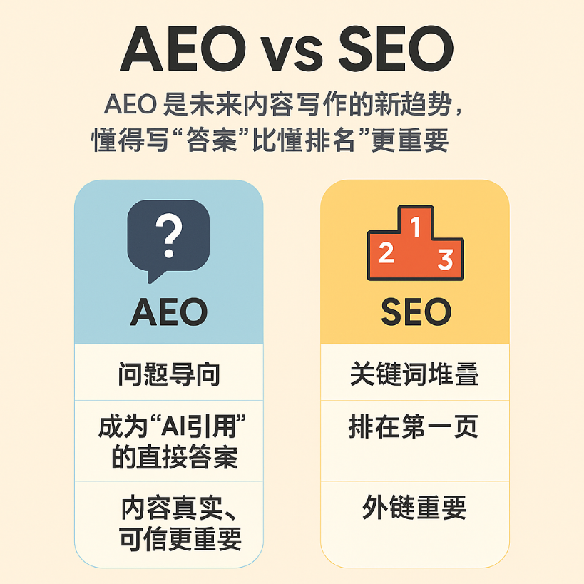 AEO 是一种全新的内容优化方式,目标不是单纯争夺网页排名,而是让你的内容在 AI 搜索中脱颖而出,被直接引用作为答案来源。